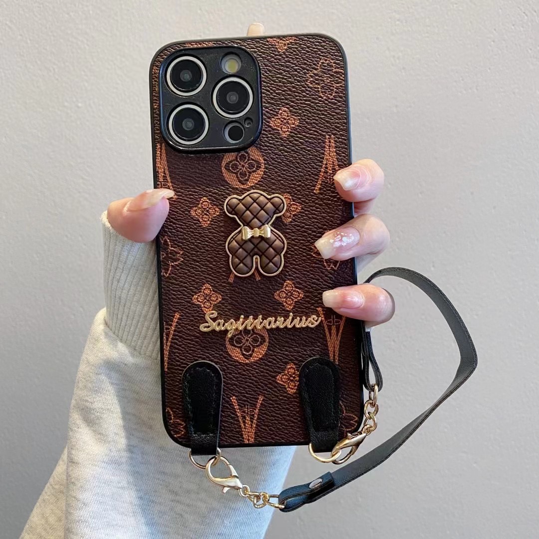 Элегантный и функциональный чехол для iPhone 16 Pro Max с декоративной отделкой. Выполнен в коричневом цвете с золотыми акцентами, включая фигурку медвежонка и изящную надпись «Sagittarius». Текстура под кожу и стильный принт придают чехлу утонченный вид. Удобный ремешок на цепочке позволяет надежно фиксировать телефон на запястье, обеспечивая дополнительную безопасность.